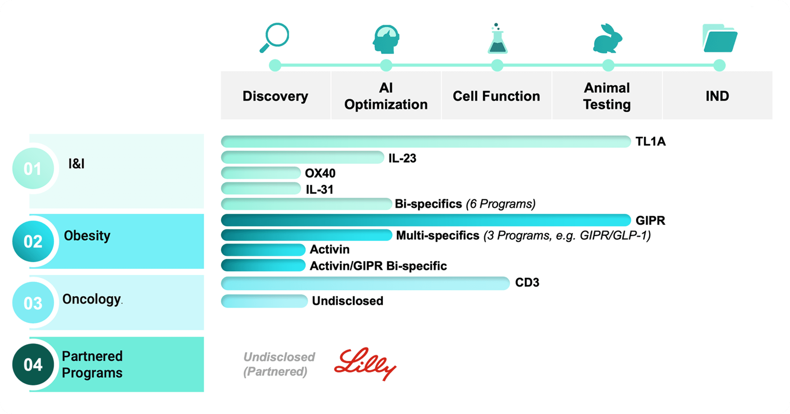 Our EXIS™️ platform drives a portfolio of fully human antibody therapeutics across multiple disease areas. We are currently advancing candidates in Immunology & Inflammation, Obesity & Metabolic Disorders, and Oncology, with plans to expand into new indications.